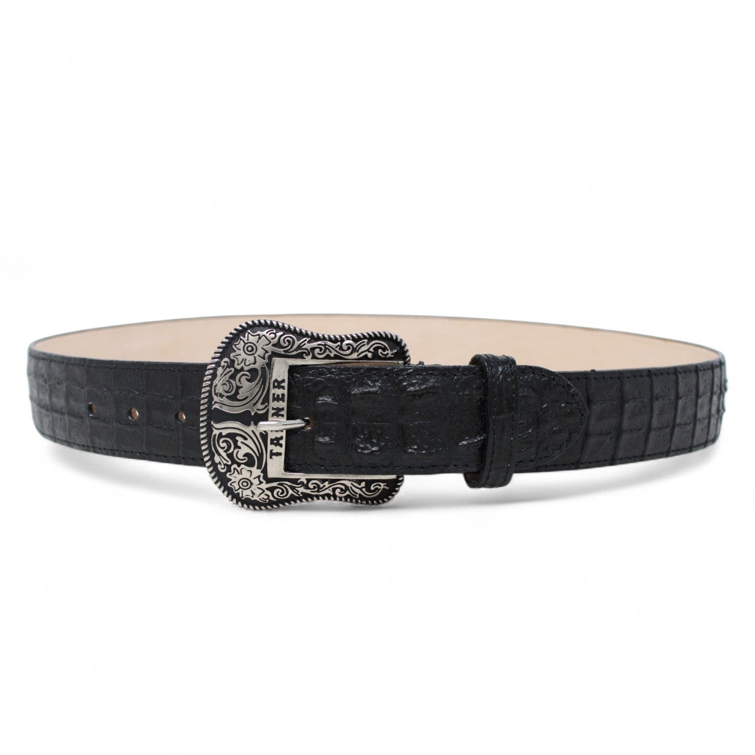 Genuine Leather Caiman Hornback Print Texas Metal Buckle Belt Black Color - Tanner Mark Boots